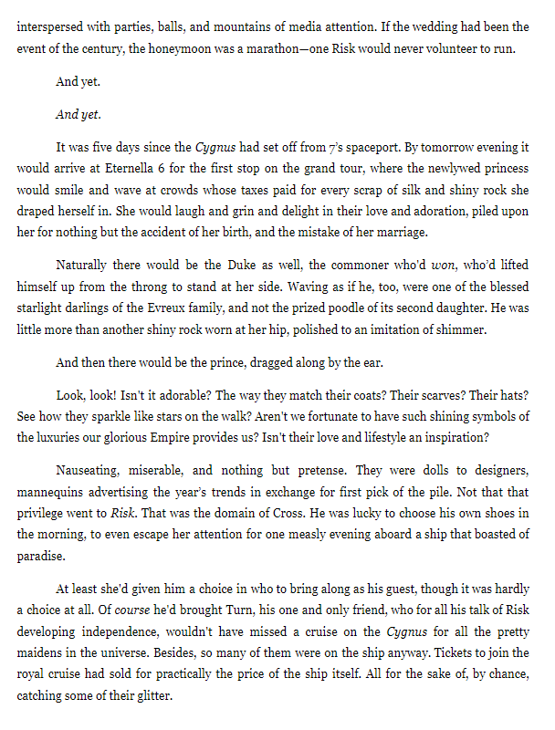 Princess Cross and her husband Dish Darsha have left for their honeymoon on the Cygnus, and dragged Risk along with them. Still conflicted over the act he'd caught Dish in on the wedding night, the prince is in no mood for a vacation. However, with his friend and lover Turn aboard the ship with him, a pleasure cruise is unavoidable.